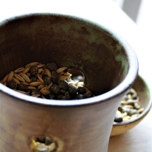 Glazed clay vessel with bullet holes, containing green crop seeds of lupins, mustard and oats with catchment bowl.